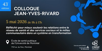 Date : mardi 5 mai, de 8 h 30 à 17 heures En présentiel à l'Agora de l'ESPUM, 7101, avenue du Parc, troisième étage, Montréal, Québec Durée : 7 heures DESCRIPTION Réfléchir pour mieux soutenir les relations entre le réseau de la santé et des services sociaux et le milieu communautaire dans un système en transformation L’amélioration durable de la santé et du bien-être des populations appelle une action concertée sur les déterminants sociaux et structurels de la santé, lesquels dépassent largement le champ et les capacités d’intervention d’un seul secteur. Au Québec, le milieu d’action communautaire et le réseau de la santé et des services sociaux (RSSS) poursuivent des objectifs communs liés à la santé, au bien-être et à l’équité. Toutefois, ils interviennent à partir de mandats, de logiques institutionnelles et de cadres de responsabilité distincts, susceptibles de présenter des zones de chevauchement ou de donner lieu à des tensions. Alors que les organismes communautaires jouent un rôle central dans la mobilisation, l’offre de services de proximité, le plaidoyer et la défense collective des droits, le RSSS exerce une responsabilité populationnelle et déploie des services structurés visant l’accessibilité, la continuité et la qualité des soins. Dans un contexte de transformation rapide du réseau, les relations entre ces deux secteurs demeurent complexes et plurivoques. Si certains organismes communautaires se reconnaissent en complémentarité du RSSS, d’autres s’affirment plutôt comme une alternative, ancrée dans des traditions, des savoirs, des valeurs et des pratiques qui leur sont propres. Cette diversité de positionnements se traduit par des écarts en termes de cultures organisationnelles, de mécanismes de financement, d’exigences de reddition de comptes et de logiques de gestion, lesquels exercent une influence déterminante sur la qualité et les retombées des collaborations intersectorielles. À la lumière de ces constats, plusieurs questions s’imposent. Comment soutenir des relations respectant pleinement l’autonomie et l’identité des milieux communautaires, qu’ils se définissent en complément ou en alternative au RSSS. Comment mieux reconnaître le rôle essentiel qu’ils jouent auprès de populations souvent mal desservies et vulnérabilisées. Quelles conditions et quelles pratiques permettraient non seulement de reconnaître leurs expertises, mais aussi de les mobiliser de façon concrète et efficace dans les actions et les politiques publiques en santé et services sociaux. Comment développer une vision commune entre le RSSS et les acteurs communautaires qui favorise la confiance, la synergie, la cohérence de l’action et des retombées durables pour les populations. La 43e édition du Colloque Jean-Yves-Rivard, organisée en partenariat avec le Centre de recherche en santé publique (CReSP), réunira des acteurs communautaires, décisionnels, professionnels et scientifiques afin de discuter de ces enjeux et de réfléchir ensemble aux leviers permettant de renforcer des partenariats durables, équitables et mutuellement bénéfiques entre le secteur communautaire et le RSSS. À qui s'adresse la formation Professionnels et gestionnaires du réseau de la santé et des services sociaux, du milieu communautaire et universitaire. Pour consulter la page web de l'événement : https://espum.umontreal.ca/lespum/departement-de-gestion-devaluation-et-de-politique-de-sante/colloque-jean-yves-rivard/#programmation-detaillee Attestation de participation Une attestation de participation sera émise sur demande. PRIX Tarifs hâtifs (avant le 8 avril) Employé(e)s du réseau de la santé, des centres de recherche et cliniciens non médecins - 75$   Employé(e)s du milieu communautaire - 40 $ Professeur(e)s, gestionnaire et médecins - 150 $ Étudiant(e)s - 25 $ - ( Si la tarification constitue une contrainte pour votre participation, merci de contacter david.buetti@umontreal.ca ) Tarifs réguliers (après le 8 avril) Employé(e)s du réseau de la santé, des centres de recherche et cliniciens non médecins  - 95 $   Employé(e)s du milieu communautaire - 50 $ Professeur(e)s, gestionnaire et médecins - 195 $ Étudiant(e)s - 35 $ -  ( Si la tarification constitue une contrainte pour votre participation, merci de contacter david.buetti@umontreal.ca ) Taxes de vente Les taxes de vente sont appliquées au moment de l'inscription, là où la loi l'exige. Les taxes sont déterminées par le lieu de résidence du participant inscrit à son compte. Modalités de remboursement En cas d'annulation de l'activité par l'ESPUM = remboursement intégral, y compris les frais de transactions bancaires. Annulation de l'inscription par le participant 7 jours ou plus avant la formation = remboursement de 75%, moins les frais de transactions bancaires. Annulation de l'inscription par le participant moins de 7 jours avant le début de la formation = remboursement de 50%, moins les frais de transactions bancaires. Aucun remboursement une fois la formation débutée. SOUTIEN Pour toute information sur cette formation ou sur le processus d'inscription : chantal.huot.1@umontreal.ca (514) 343-5607, les lundis, mardis et mercredis
